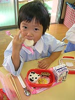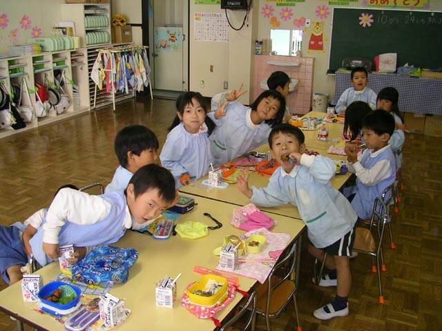 こっちクラスはお外でお弁当食べてるにゃん。今日は風もないし、あったかいから、ちょうどいいよにゃ。