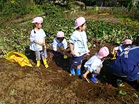 足元におイモが出掛かってるから、頑張って掘ってみてにゃ!! |