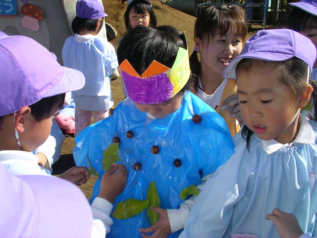 みんなでかわいく落ち葉をつけてあげてにゃ。チョビスケは背中に大きな葉っぱをつけて、天使のようにしてあげようかにゃあ・・・ |