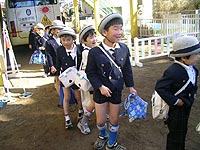 今日も地域探検の小学生が遊びにきてくれたにゃん。まずは、お天気なので、カンケリして遊ぶんだにゃん。